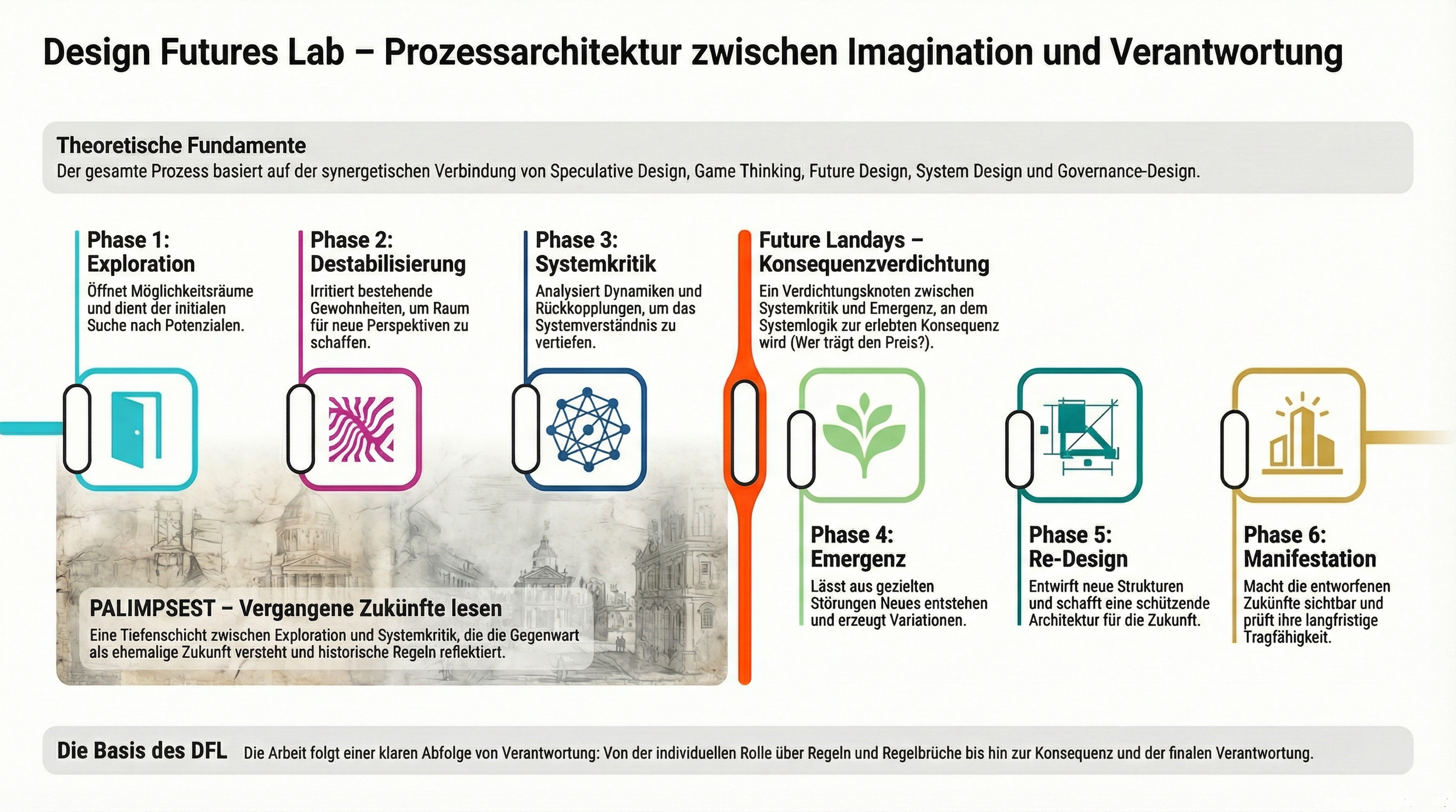 Es bündelt Theorie, Praxis und Haltung des Design Futures Lab – nicht als Baukasten, sondern als strukturierte Orientierung in offenen Prozessen.